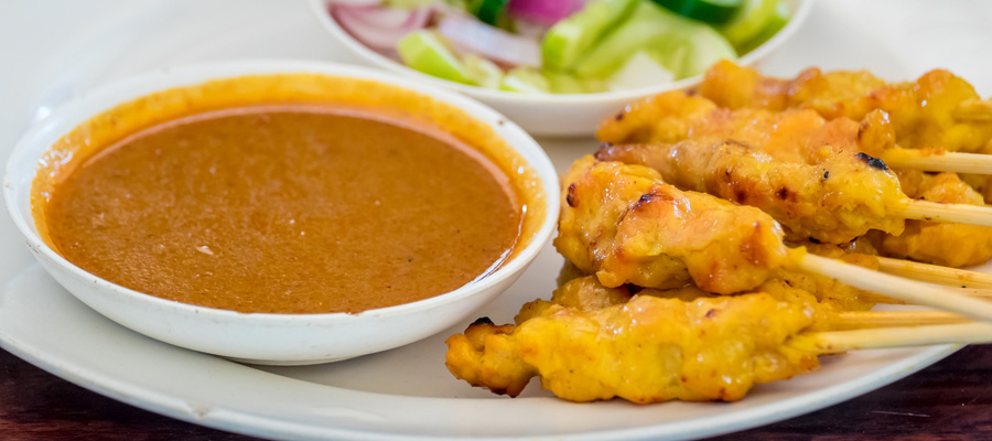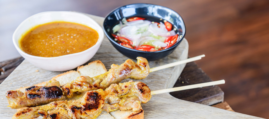 Autre type de marinade, les sauces Satay extrême-orientales, très denses, enrobent en finesse les crevettes ou la volaille en dés que l’on projette de cuire au gril